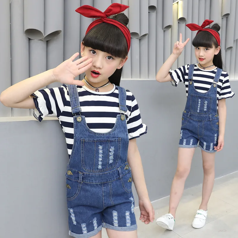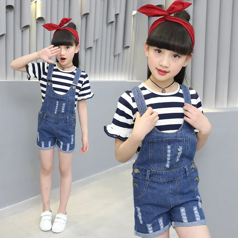 Special Price of 2019 new summer baby girl clothes set cotton striped short sleeve t shirt +denim overalls body suit