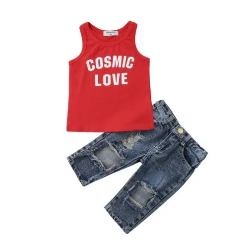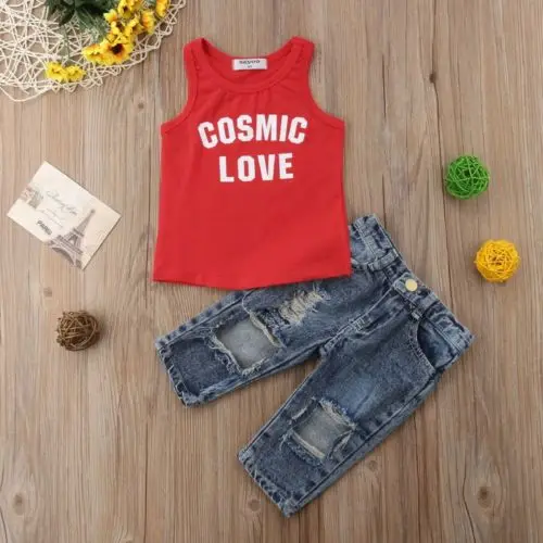 Best Chance of Summer Fashion Toddler Kid Baby Girl Letter Print Red Sleeveless Vest Tops+Denim Ripped Pants Jeans